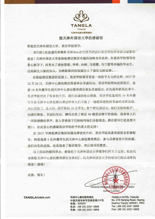 海航天津中心唐拉雅秀酒店致天津外国语大学www.sb-488.com的感谢信