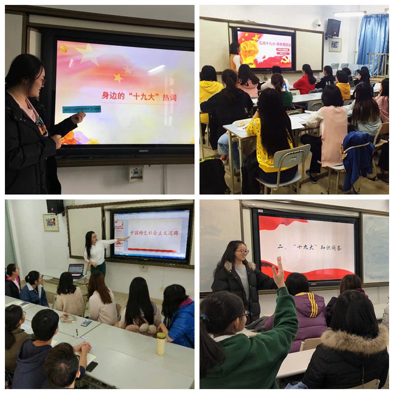 十九大召开之后,www.sb-488.com各团支部陆续开展理论学习,一场场关于十九大的理论知识讲解如火如荼。160118团支部在逸夫楼教室组织团员学习总书记十九大报告,认真倾听了习总书记对于过去五年的总结以及未来五年的计划。大家对此都深有感触,任政同学“作为新一代知识青年,我们有责任有义务努力学习科学文化知识,为国家的发展增砖添瓦,为实现中华民族的伟大复兴做出贡献”的发言反响热烈;160112团支部组织了一场生动、有意义的知识竞赛,同学们在抢答环节争先恐后,积极讨论;“悦”读分享会上,同学们纷纷介绍了自己喜爱的书籍,如汪曾祺先生的《受戒》、川端康成的《雪国》以及《共产党宣言》等;160114团支部的主题团日活动分为“我们的十九大故事”“身边的十九大热词”“十九大知识竞赛”“看图猜事件,重温复兴之路”“让党常驻心中应该依靠理论还是实践的辩论赛”五个环节,支部团员参与热情高涨;160105团支部结合英语专业特色,搜集十九大热词“极不平凡的五年”、“新时代中国特色社会主义”等进行分享,在拓宽专业知识面的同时,引领青年关注时事聚焦十九大。